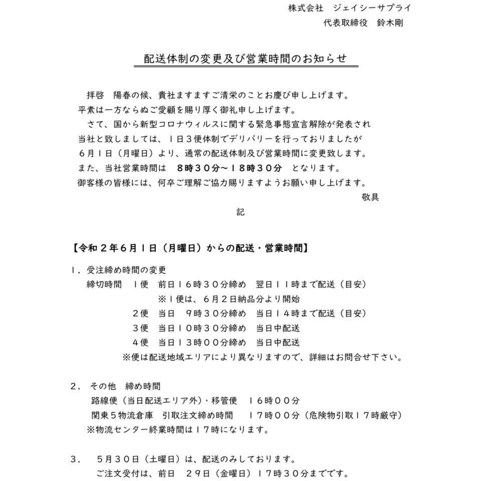 緊急事態宣言解除に伴い営業体制を変更いたします。 当社営業時間は6月1日から通常営業になります。一部配送については通常と異なりますのでご注意願います。詳しくは当社営業担当までご連絡ください。