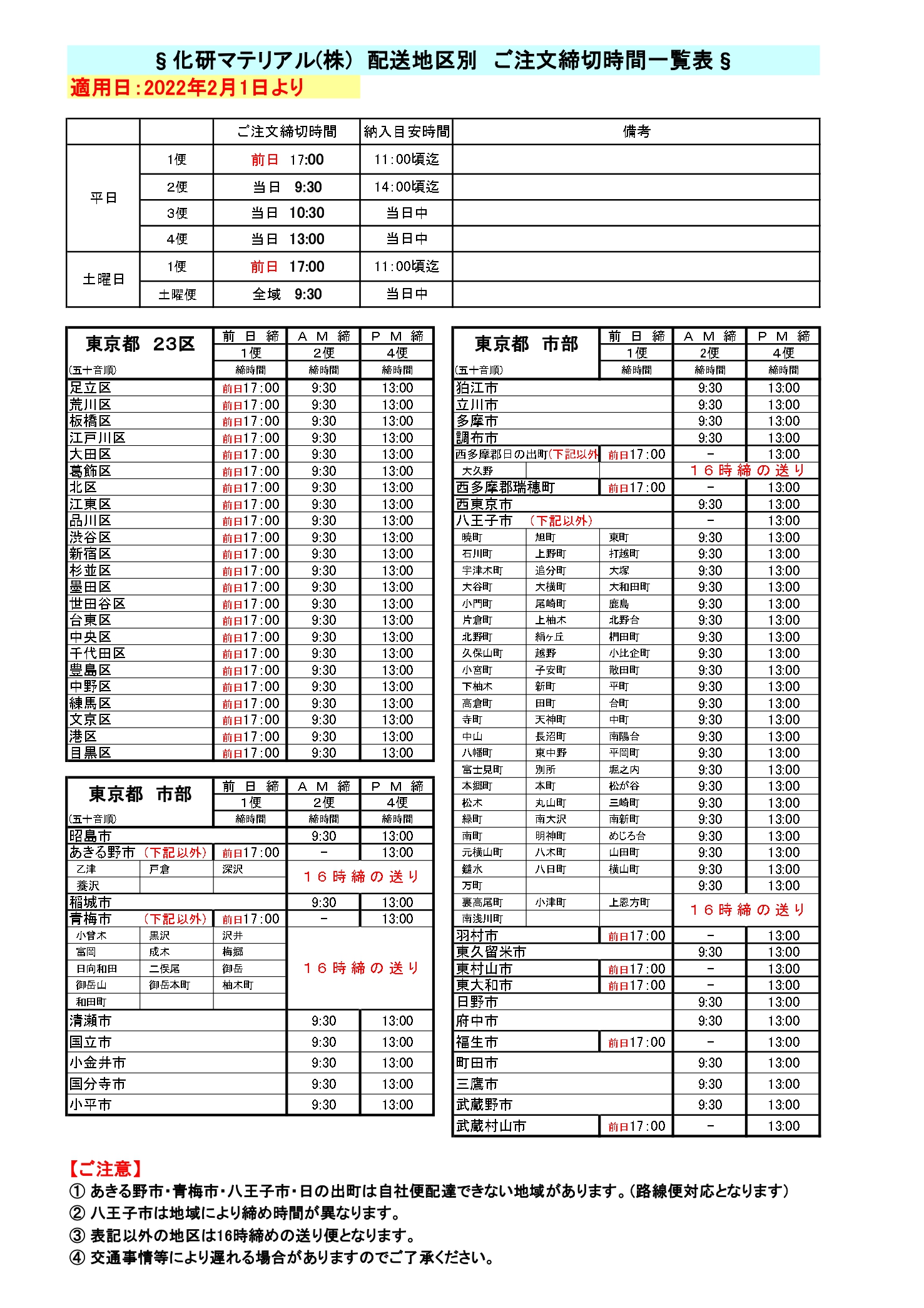 繁忙期に入りましたので弊社自社便の各エリアオーダー締時間を